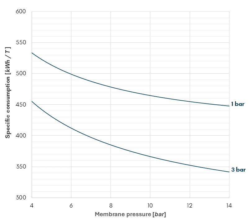 The specific consumption depends on the pressure at the membranes and the required liquefaction pressure.