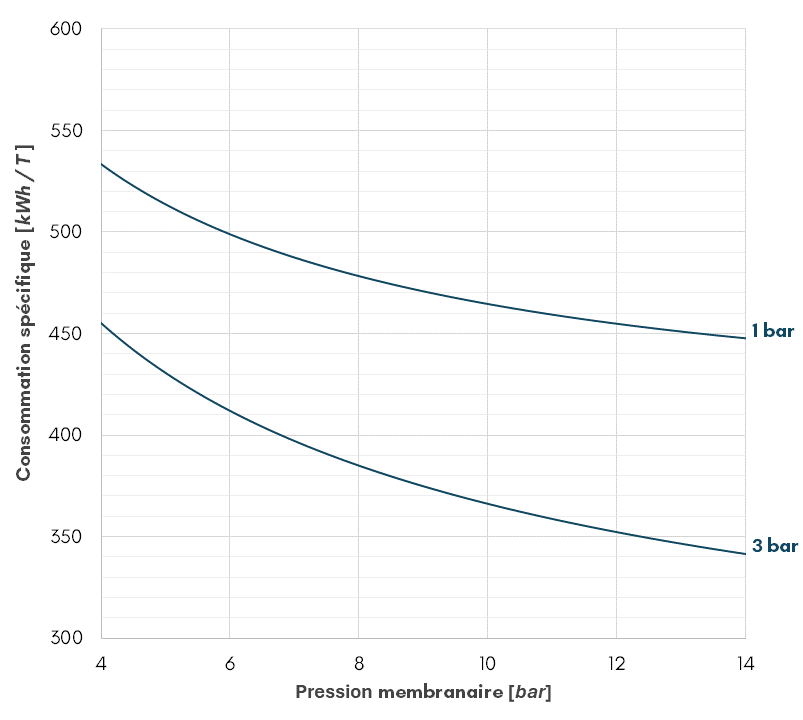 La consommation spécifique dépend de la pression aux membranes et de la pression de liquéfaction requise.