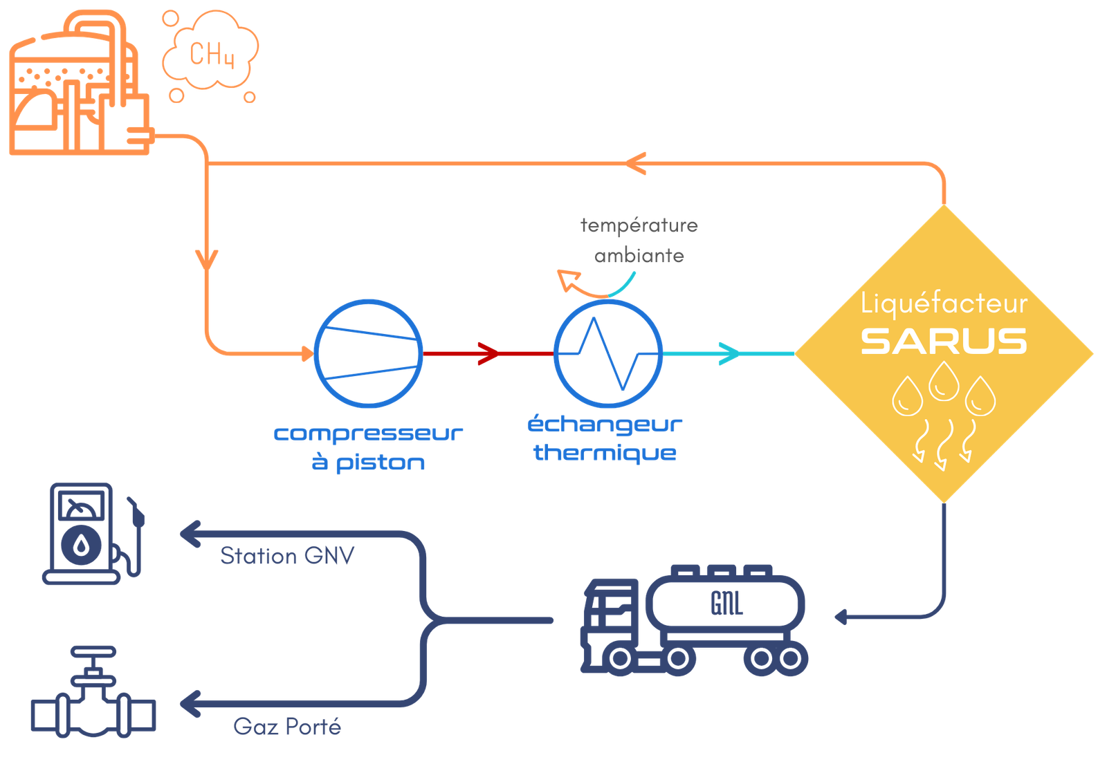 À la sortie des membranes, après épuration, notre technologie permet la liquéfaction du biométhane sans apport externe en azote liquide, sans boucle auxiliaire et avec un nombre d’équipements réduits.
